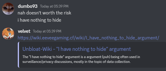 The "I have nothing to hide" argument is a argument (puh) being often used in surveillance/privacy discussions, mostly in the topic of data collection.