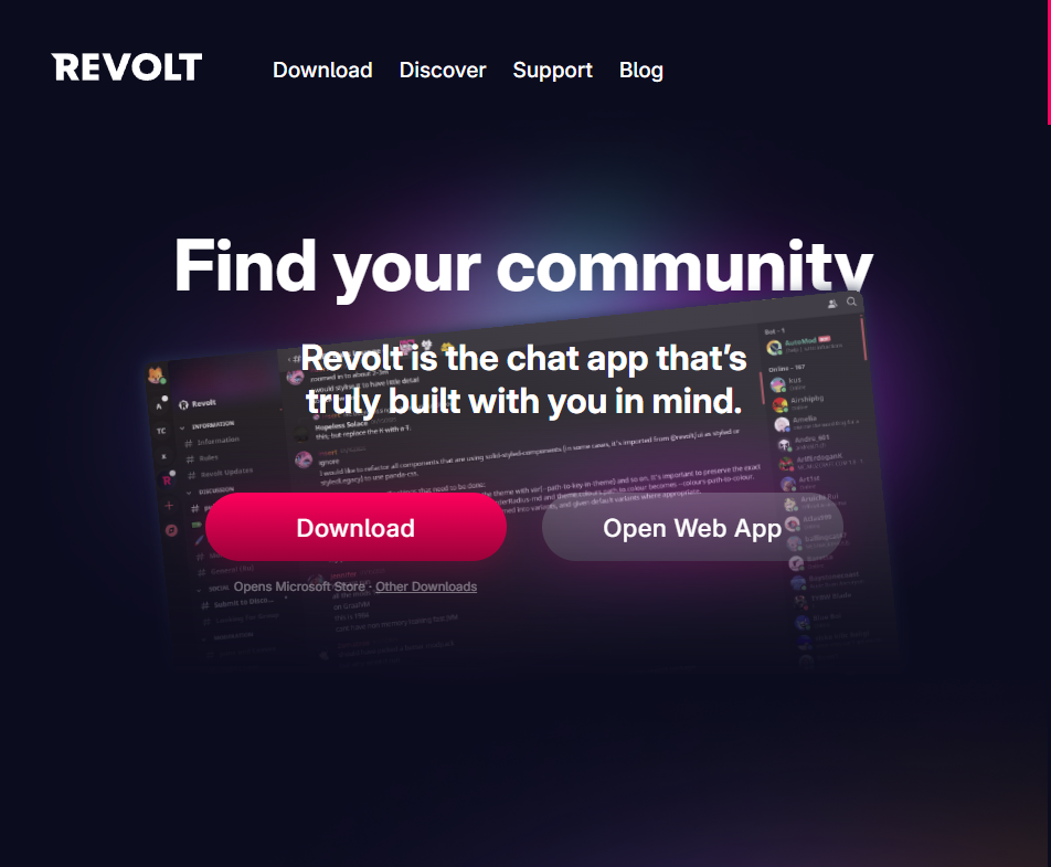 Revolt has, a quite large community for a very unknown platform in comparison with Discord. Popular and grown servers will be shown in the Discovery page in the client.